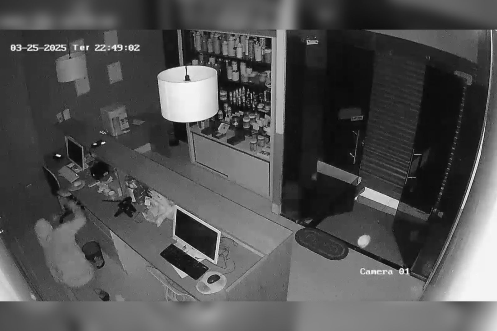Pouco depois das 3h, dois ladrões forçaram a entrada do estabelecimento, levantando o portão o suficiente para que um deles conseguisse acessar o interior da loja.
