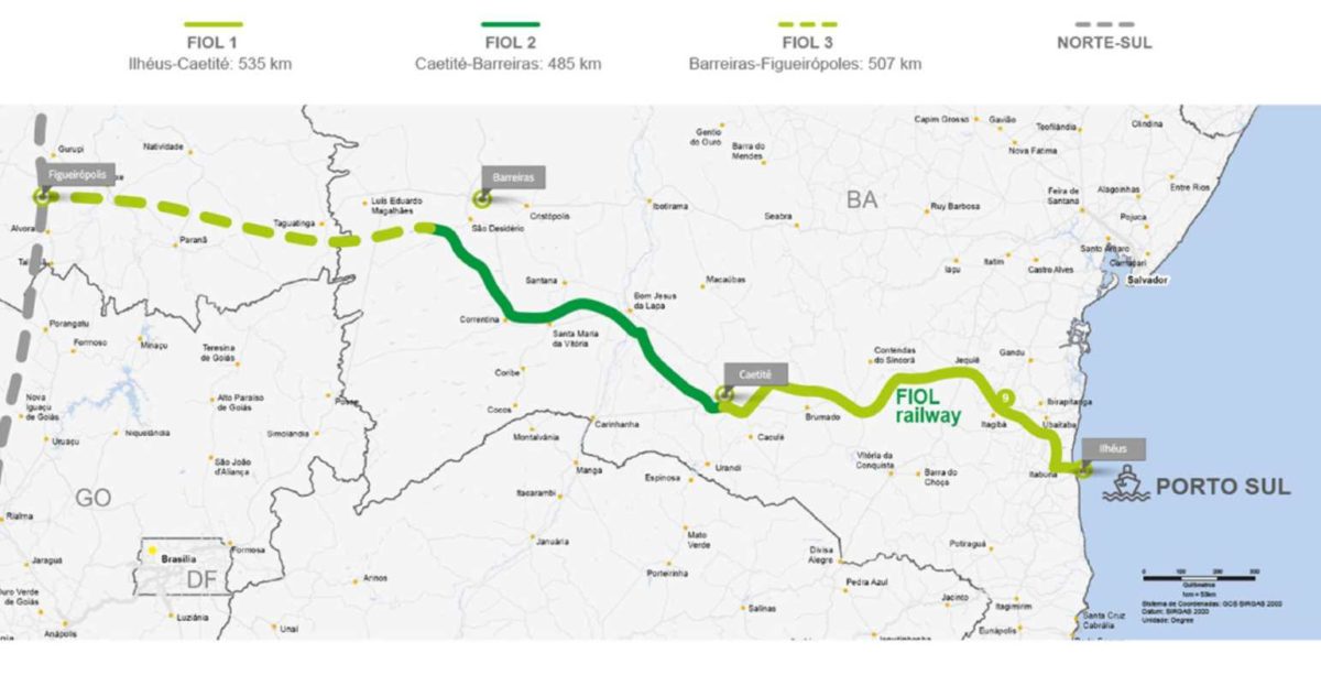 A concessão da Fiol Trecho 1, assinada em setembro de 2021 com o Ministério da Infraestrutura, tem prazo de 35 anos. A ferrovia passará por 19 municípios e terá capacidade para transportar até 60 milhões de toneladas de carga por ano.