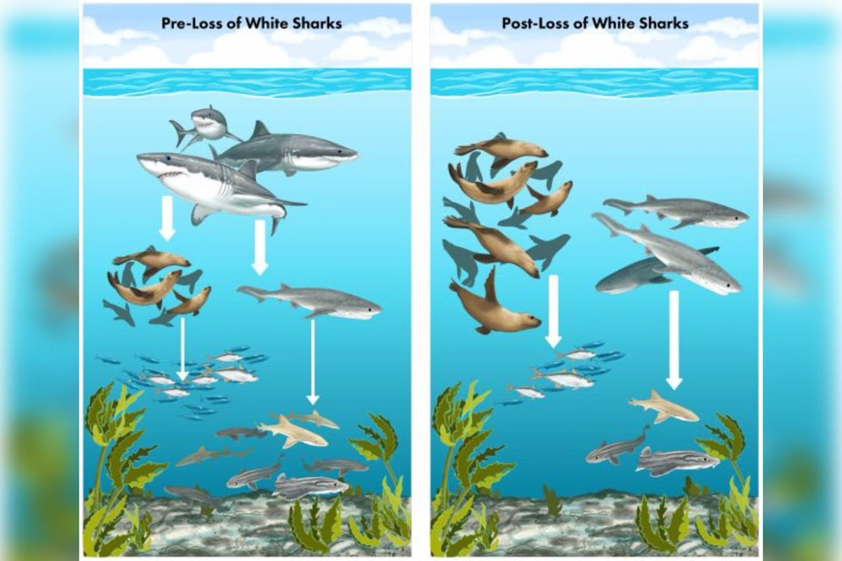 Por exemplo, sem a espécie desaparecida para controlá-los, as populações de focas-do-cabo e tubarões-de-sete-guelras aumentaram, reduzindo a quantidade de suas presas. Esse efeito cascata pode levar a uma competição intensa por alimentos, resultando na morte de indivíduos mais fracos e até na transformação permanente do ecossistema.