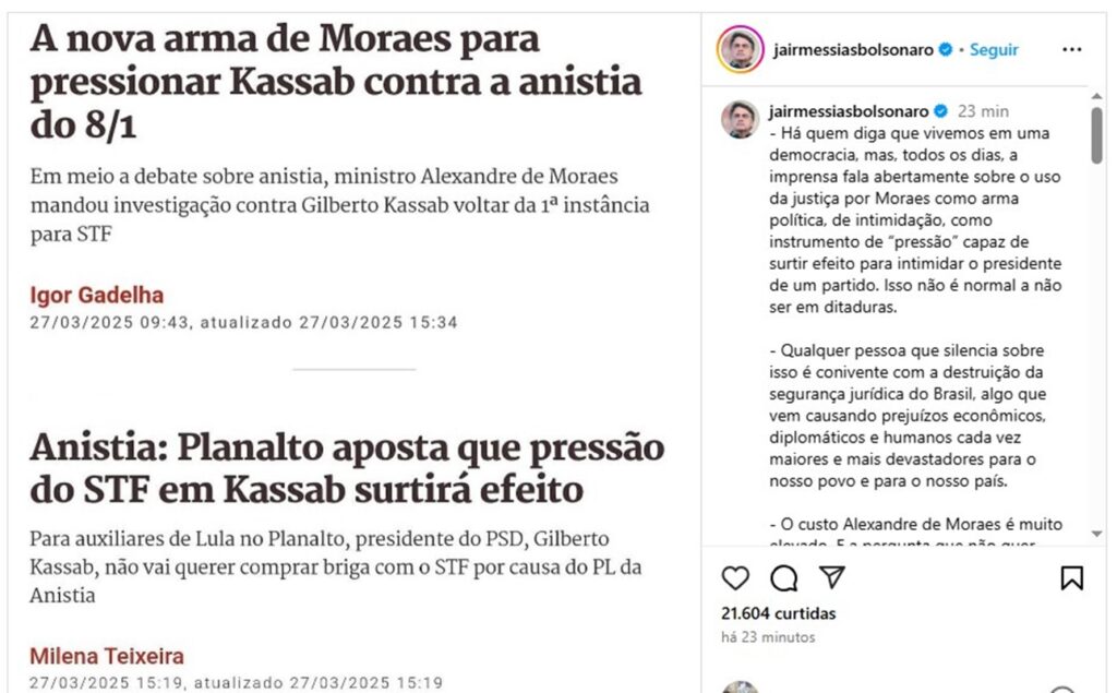 O ex-presidente Jair Bolsonaro (PL) reagiu, na noite desta quinta-feira (27/3), à notícia de que o ministro Alexandre de Moraes mandou uma investigação contra o presidente do PSD, Gilberto Kassab, voltar da primeira instância para o STF. A decisão, conforme noticiado em primeira mão pela coluna mais cedo, foi assinada por Moraes no último dia […]