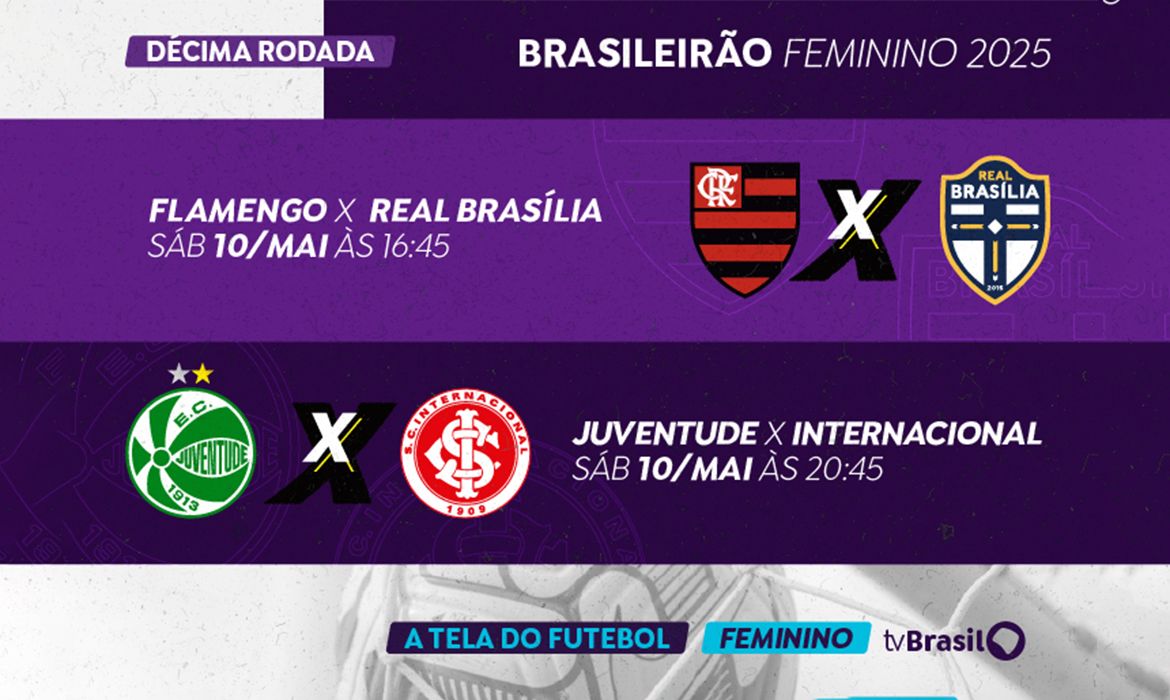 A TV Brasil exibe neste sábado (10) dois confrontos válidos pela décima rodada do Campeonato Brasileiro de Futebol Feminino – Série A1. Às 16h45, Flamengo e Real Brasília se enfrentam no Rio de Janeiro e, mais tarde, às 20h45, Juventude e Internacional disputam o clássico gaúcho na cidade de Bento Gonçalves.